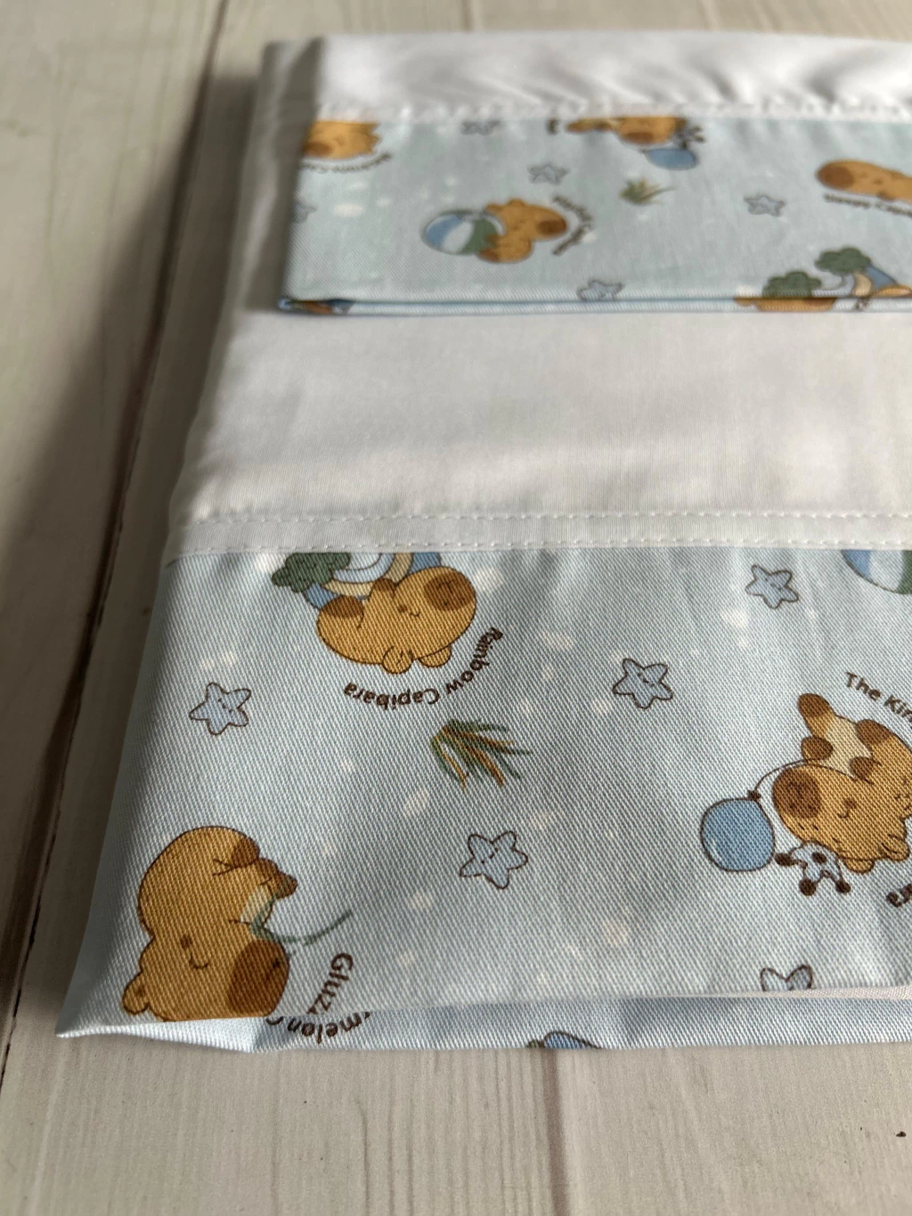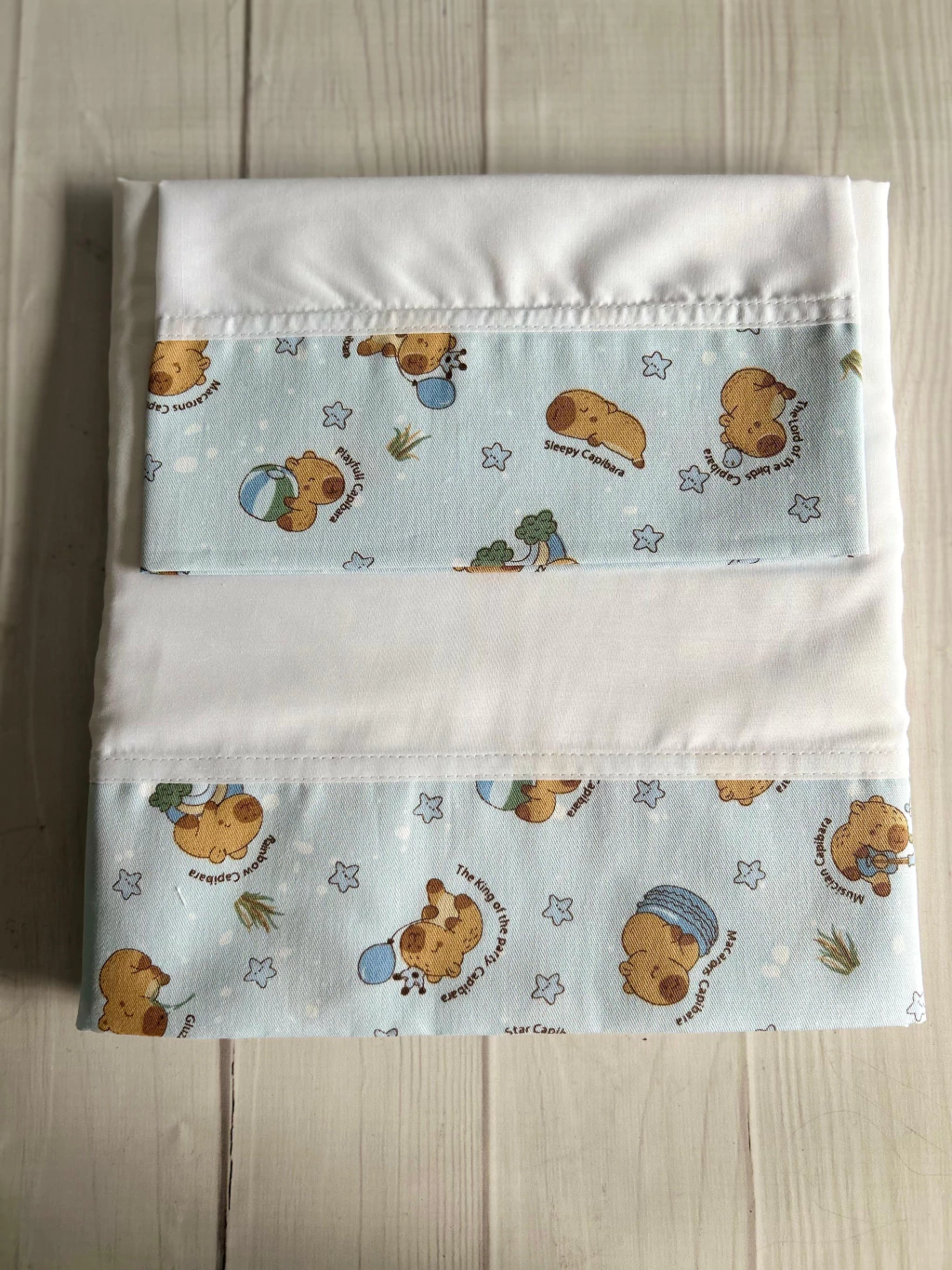 Medidas: 1,20 mt x 0,60 cm x 0,15 cm de alto Material: 100% algodón Incluye: Guarda estampada y funda de almohada